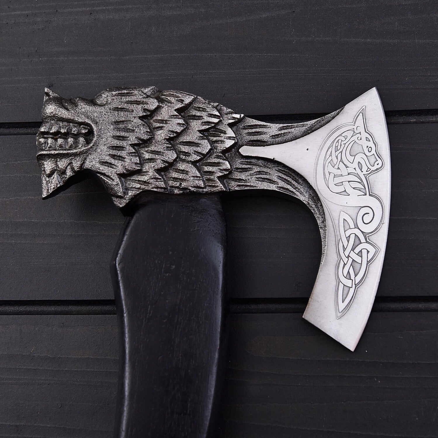 This 17.5-inch Wolf Head Viking axe features a 1095 high carbon steel blade with an etched finish and a distinctive wolf head design, combining traditional craftsmanship with bold styling. Designed for collectors, outdoor enthusiasts, and display, it reflects classic Viking-inspired aesthetics.