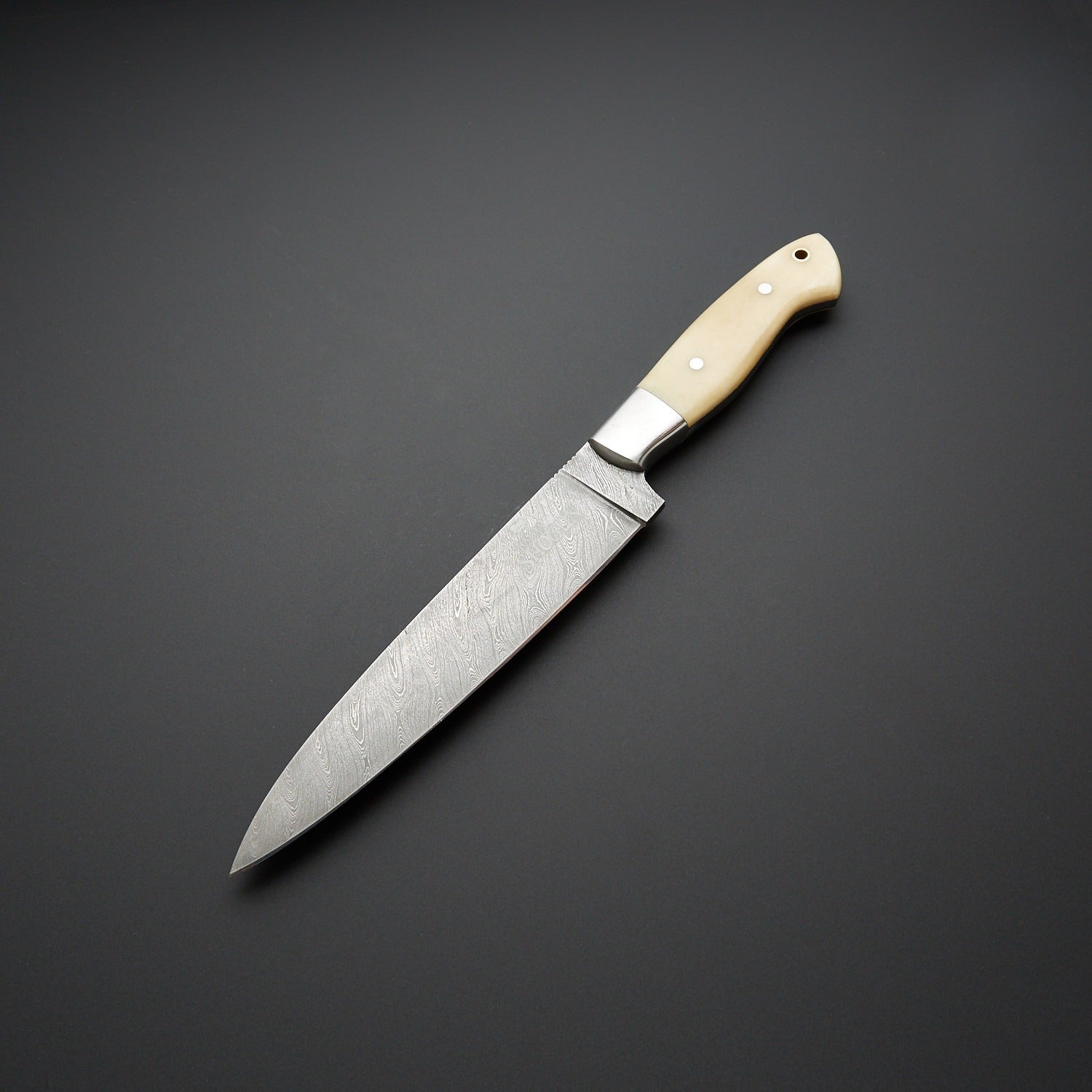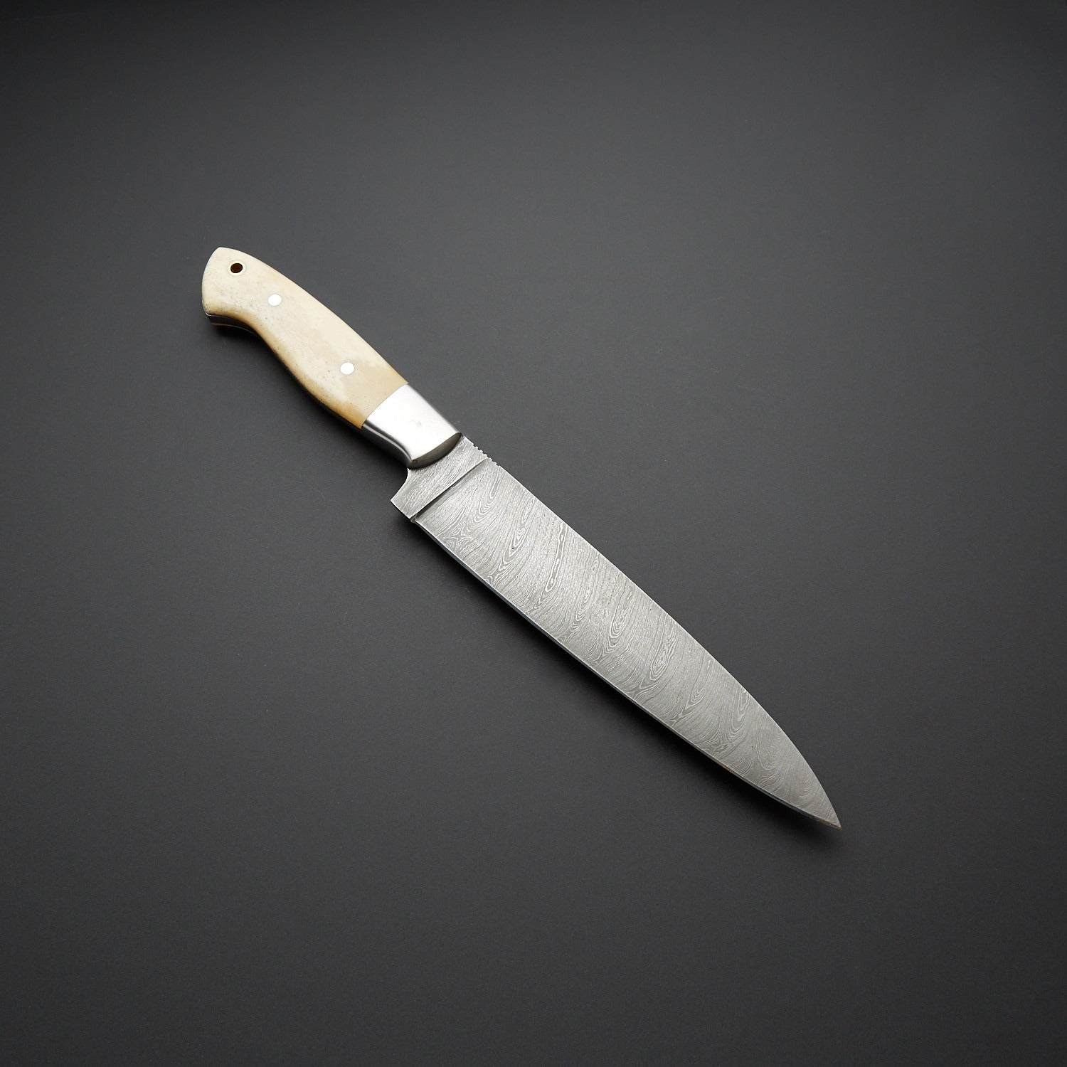 Mule Deer Bone handle with stainless bolsters offers comfort and control for long cooking sessions.