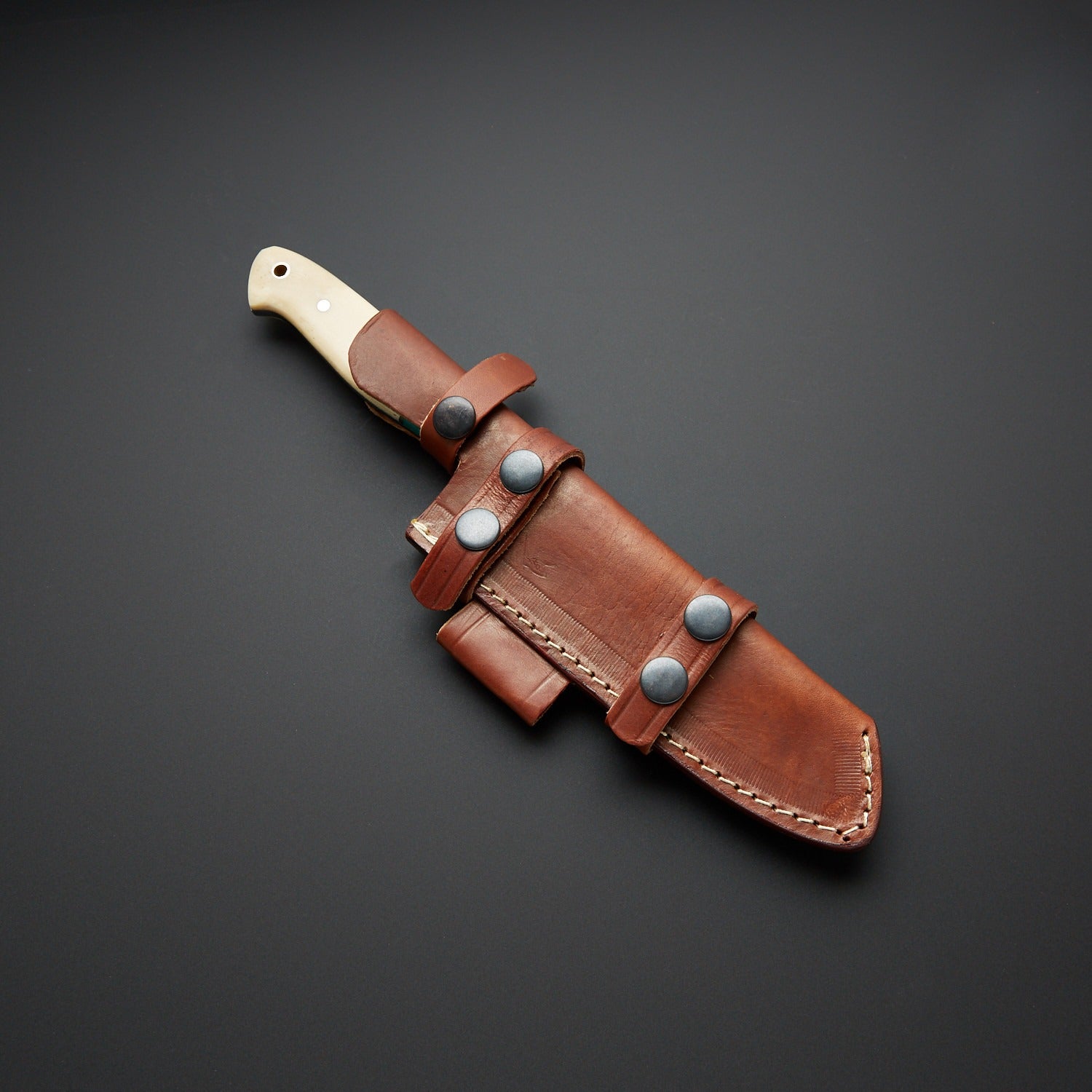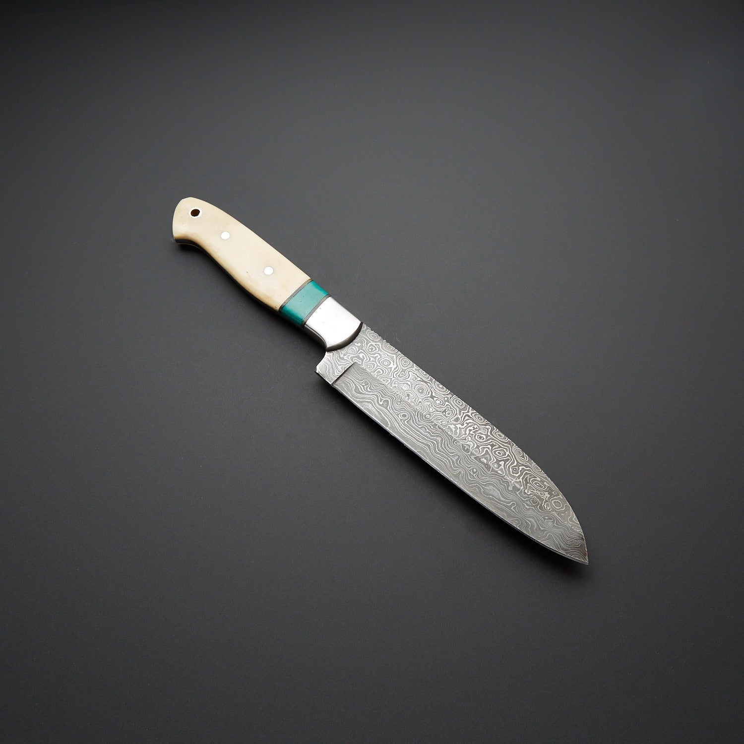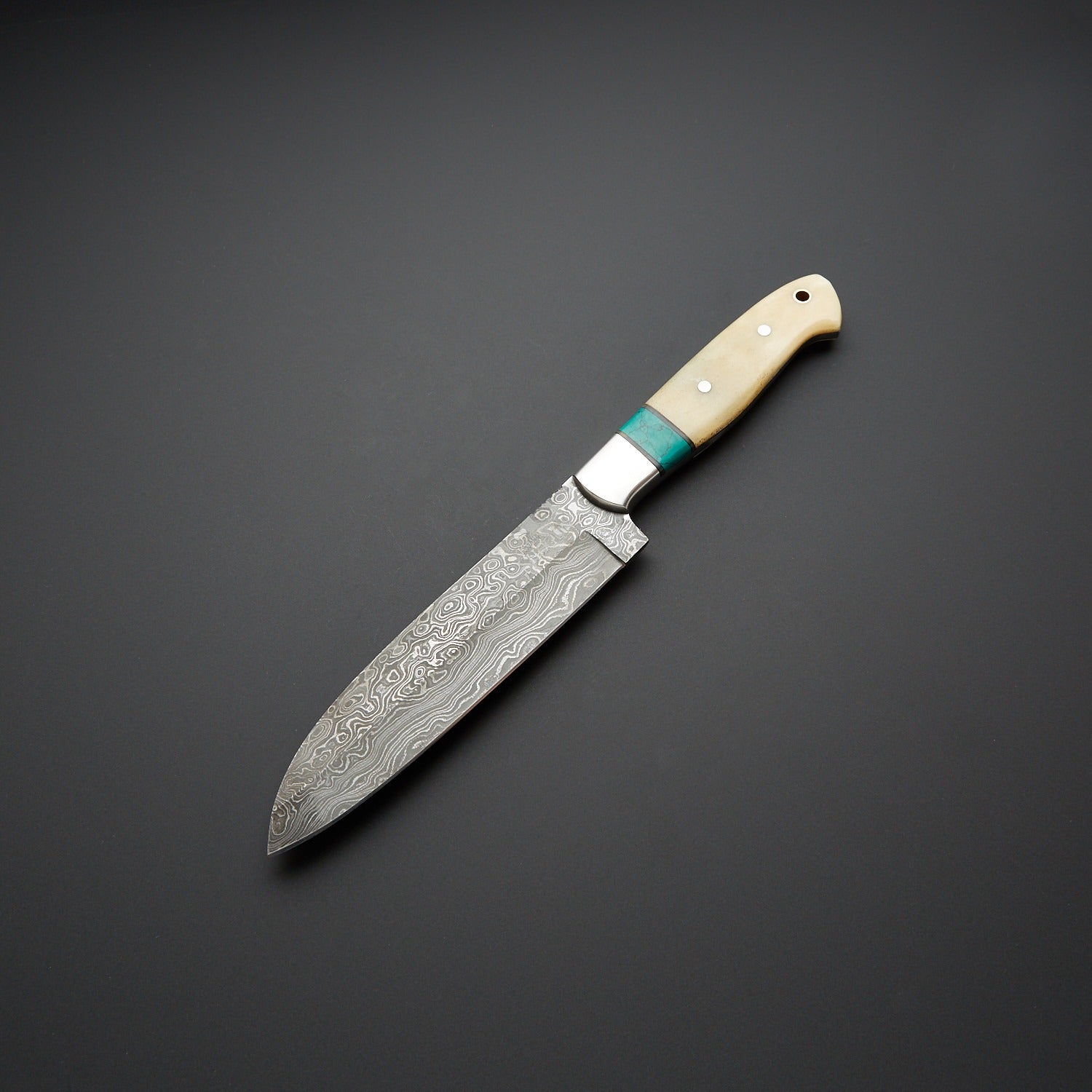 A collector’s masterpiece thanks to the striking Damascus steel pattern and turquoise bone handle.